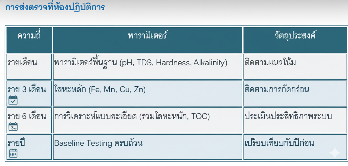 ข้อมูลจาก Baseline Testing ช่วยให้คุณวางแผนการบำรุงรักษาเชิงป้องกัน (Preventive Maintenance) ได้อย่างมีประสิทธิภาพ คุณสามารถกำหนดความถี่ในการเปลี่ยนไส้กรอง การล้างระบบ และการตรวจสอบอุปกรณ์ตามลักษณะของน้ำดิบ