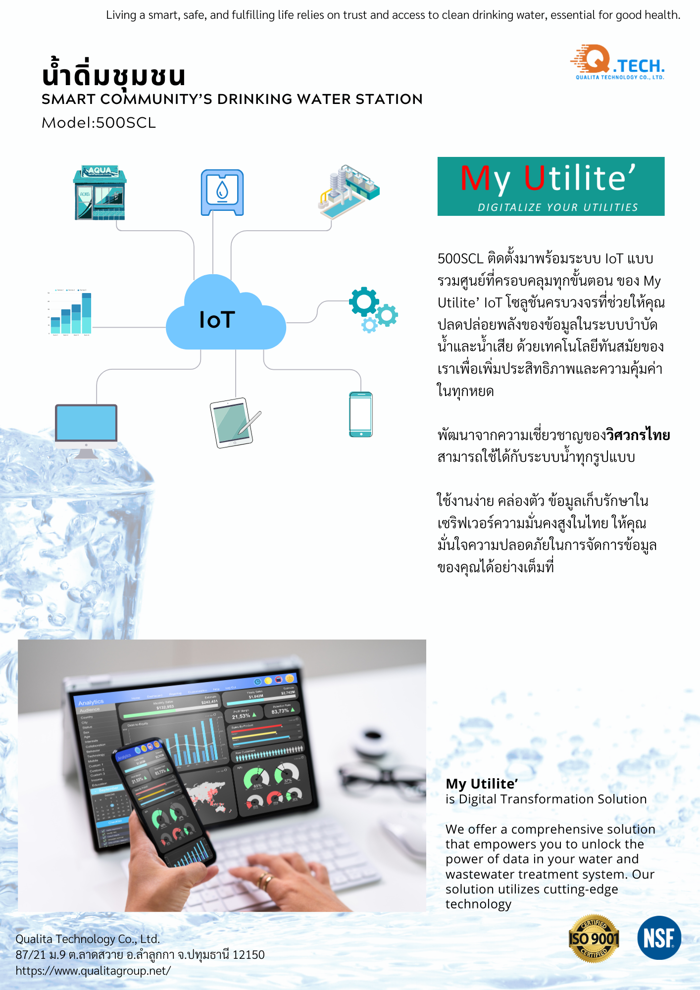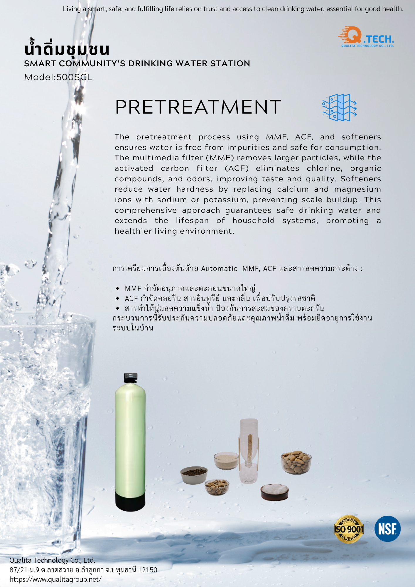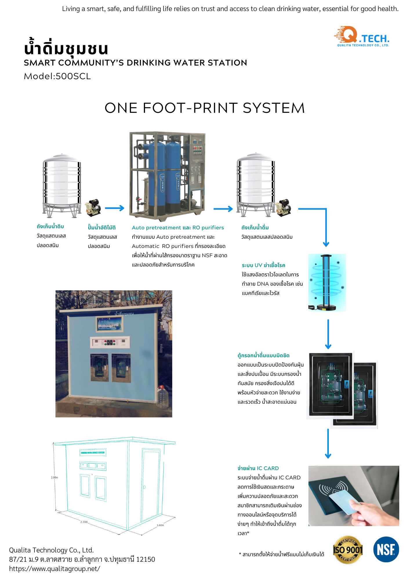 สำเร็จรูปพร้อมใช้, ติดตั้งโดยตรงกับน้ำประปา, มีผนังมิดชิดพร้อมหลังคา, มีระบบออนไลน์มอนิเตอร์, ไส้กรอง, มาตราฐาน, เหมาะสำหรับชุมขน/โรงเรียน/ตลาด/ชุมชน ฯ