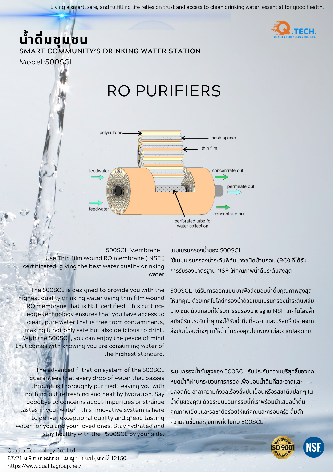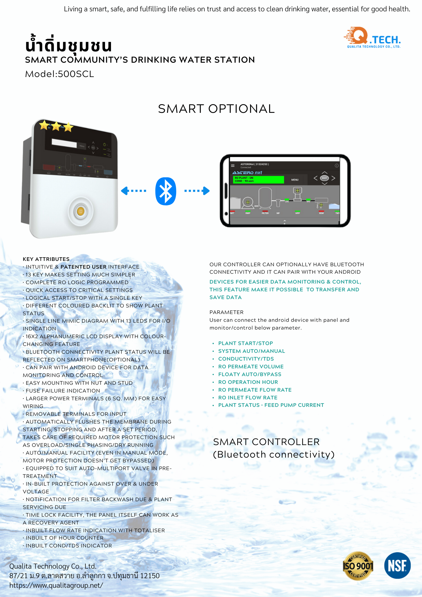 ออกแบบระบบในชุดเดียว เคลื่อนที่ขนย้ายง่าย ประหยัดพื้นที่ เหมาะสำหรับการปรับปรุงคุณภาพน้ำได้ทันที ใช้งานง่ายแต่ทนทาน และเหมาะสำหรับงานชุมชนหรือโรงกรองน้ำ SML, ให้การจ่ายเงินง่ายและสะดวก ทำให้สมาชิกในชุมชนเข้าถึงน้ำดื่มสะอาดได้โดยไม่ต้องพกเงินสด ฟีเจอร์นี้มีประโยชน์ในสภาพแวดล้อมที่วุ่นวาย ระบบ IC Card ช่วยเพิ่มประสบการณ์และรับประกันการชำระเงินที่ปลอดภัย รองรับโครงการ Smart Community วสอดคล้องกับเป้าหมายในการจัดหาน้ำที่เข้าถึงได้และยั่งยืน, ระบบการกรองระบบกรองรุ่น 500SCL ทำงานอัตโนมัติผ่านตัวควบคุมอัตโนมัติและมีระบบตรวจวัดค่า EC meter ติดตั้งเป็นชุดเดียวกัน เพื่อตรวจสอบและควบคุมกระบวนการกรองน้ำ RO อย่างแม่นยำ เทคโนโลยีนี้รับประกันประสิทธิภาพการทำงานที่ดีเยี่ยมและมีประสิทธิภาพสูงสุด รักษามาตรฐานคุณภาพน้ำให้คงที่ ผู้ใช้งานสามารถวางใจได้ว่าระบบจะทำงานได้อย่างราบรื่นและมีประสิทธิภาพสูง