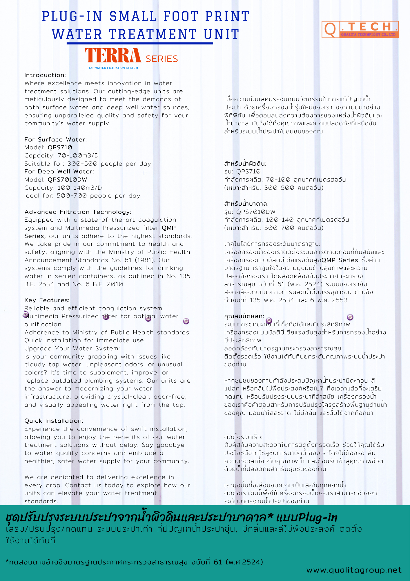 เครื่องกรองน้ำของเราติดตั้งระบบการตกตะกอนที่ทันสมัยและเครื่องกรองแบบมัลติมีเดียแรงดันสูงQMP Series ซึ่งผ่านมาตรฐาน เราภูมิใจในความมุ่งมั่นด้านสุขภาพและความปลอดภัยของเรา โดยสอดคล้องกับประกาศกระทรวงสาธารณสุข ฉบับที่ 61 (พ.ศ. 2524) ระบบของเรายังสอดคล้องกับแนวทางการผลิตน้ำดื่มบรรจุภาชนะ ตามข้อกำหนดที่ 135 พ.ศ. 2534 และ 6 พ.ศ. 2553